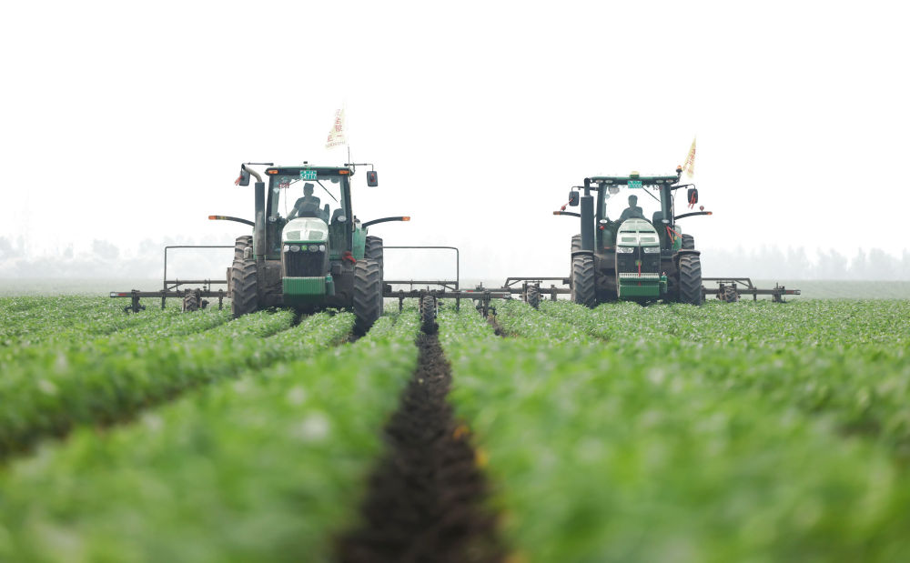 2024年7月6日,在黑龍江北大荒集團北安分公司長水河農(nóng)場有限公司,大型農(nóng)機在大豆地塊進行中耕作業(yè)。