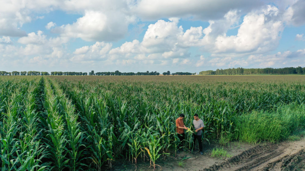 2024年8月8日,在吉林省梨樹縣孤家子鎮(zhèn)兩家子村,當(dāng)?shù)剞r(nóng)業(yè)發(fā)展服務(wù)站高級農(nóng)藝師蘭雨壯(左)與四平市強盛農(nóng)機農(nóng)民專業(yè)合作社負責(zé)人查看玉米長勢(無人機照片)。多年來,地處世界“黃金玉米帶”的全國產(chǎn)糧大縣吉林省梨樹縣,強化科技在農(nóng)業(yè)生產(chǎn)中的支撐作用,持續(xù)提升糧食和重要農(nóng)產(chǎn)品穩(wěn)產(chǎn)保供能力。