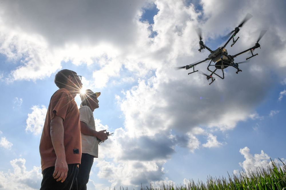 2024年8月8日,在吉林省梨樹縣孤家子鎮(zhèn),當(dāng)?shù)剞r(nóng)業(yè)發(fā)展服務(wù)站高級農(nóng)藝師蘭雨壯(左)查看無人機作業(yè)情況。