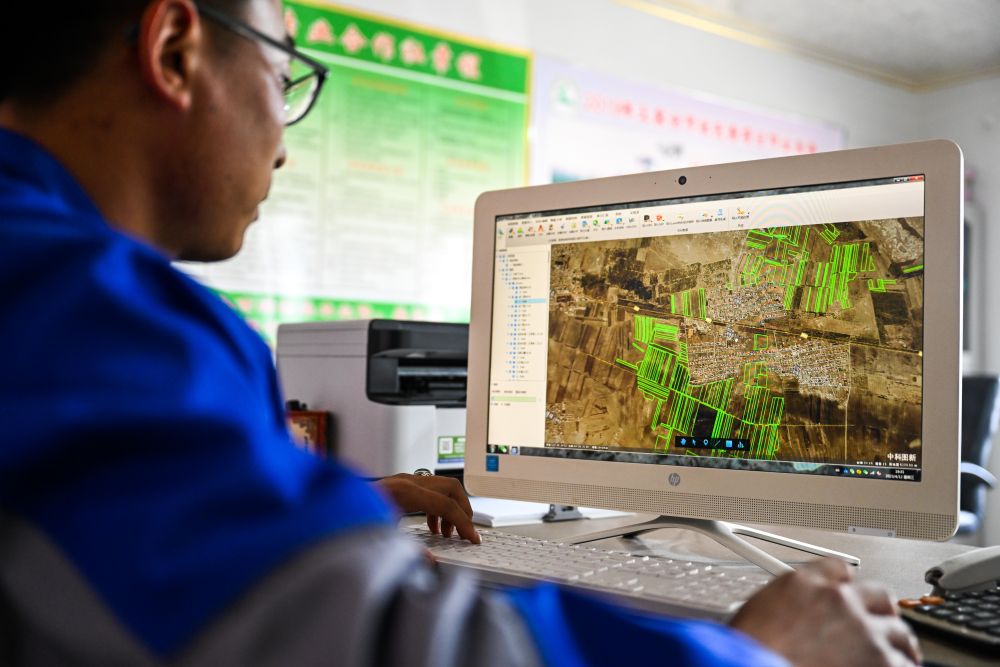 2023年4月12日,在內(nèi)蒙古通遼市科爾沁左翼中旗腰林毛都鎮(zhèn),一家農(nóng)業(yè)合作社的負責(zé)人查看耕種衛(wèi)星地圖。