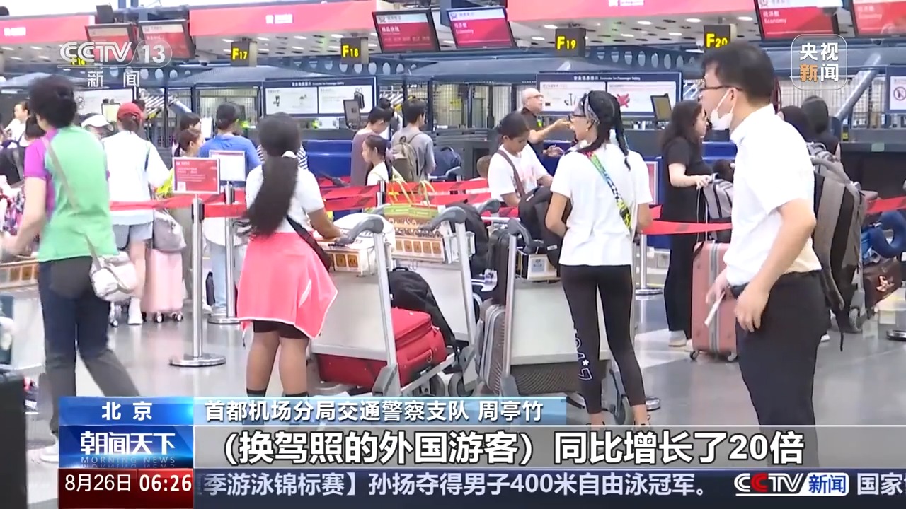 首都機場分局交通警察支隊 周亭竹:換駕照的外國游客同比要增長了20倍。中國的臨時駕駛許可,他只可以開租賃的汽車,私家車是不能開的,我們在窗口會提醒到他。