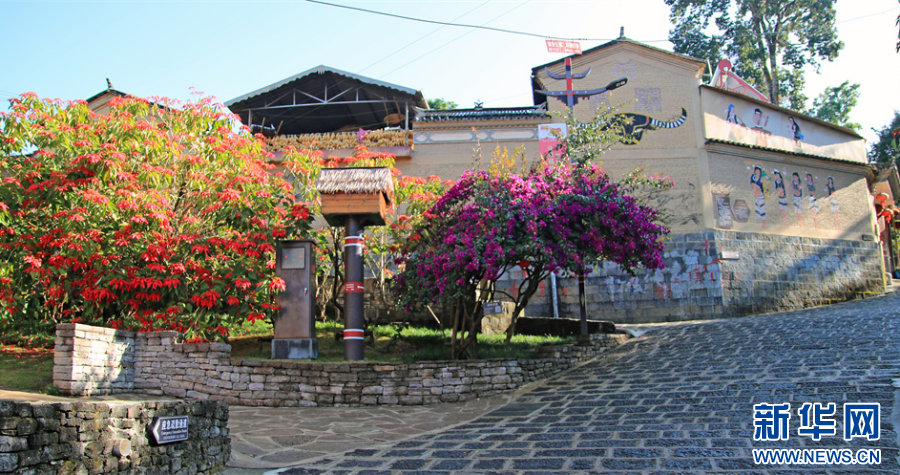 ??來(lái)到國(guó)門(mén)新村,遠(yuǎn)遠(yuǎn)便能看到由“刀山火海”、火炬、三弦琴、箭及裝飾物組成“一把弩”形狀的寨門(mén)。
