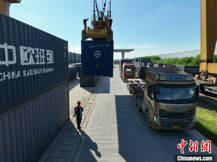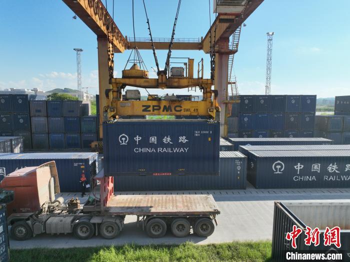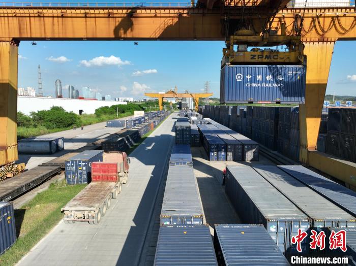 8月26日,廣西南寧國(guó)際鐵路港內(nèi),鐵路職工頂著下午的烈日,正在為發(fā)往越南的貨運(yùn)班列裝卸貨物。該鐵路港是廣西始發(fā)中越班列的核心場(chǎng)站。國(guó)鐵南寧局提供的信息顯示,今年前7個(gè)月,廣西始發(fā)中越班列累計(jì)發(fā)運(yùn)貨物6850標(biāo)箱,同比增長(zhǎng)16倍;其中7月份發(fā)運(yùn)1922標(biāo)箱,超過(guò)今年一季度發(fā)運(yùn)量總和,為今年以來(lái)第三次刷新單月發(fā)運(yùn)量紀(jì)錄。圖為集裝箱擺滿場(chǎng)站,等待裝車。王以照 攝