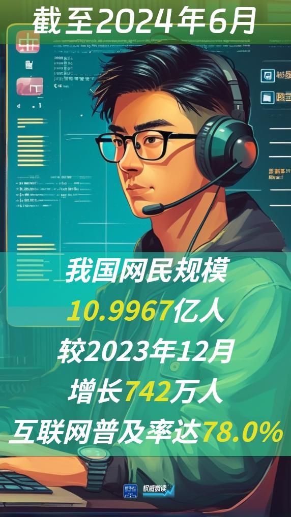8月29日,中國互聯(lián)網絡信息中心(CNNIC)發(fā)布第54次《中國互聯(lián)網絡發(fā)展狀況統(tǒng)計報告》。報告顯示,截至2024年6月,我國網民規(guī)模近11億人(10.9967億人),較2023年12月增長742萬人,互聯(lián)網普及率達78.0%。