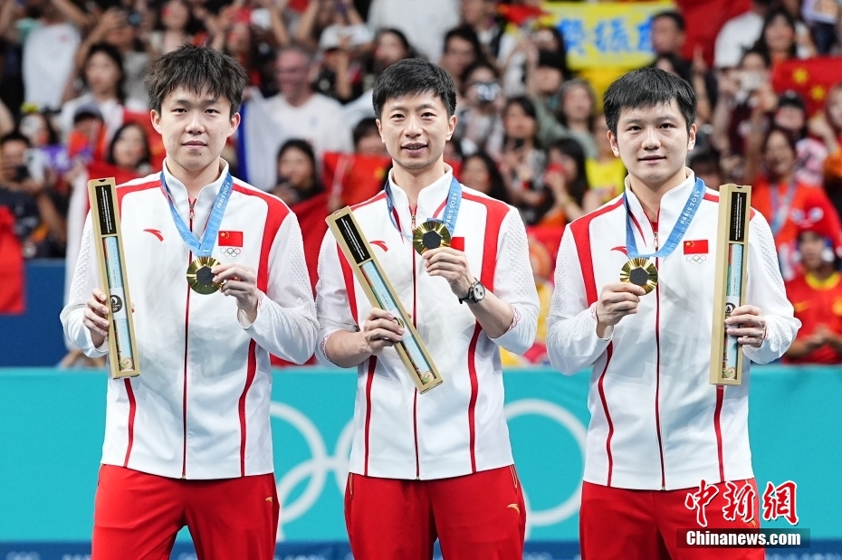 在巴黎奧運會乒乓球男團金牌賽中,中國隊以3比0戰(zhàn)勝瑞典隊,獲得冠軍。中新社記者 趙文宇 攝