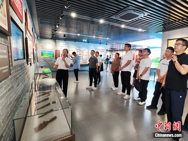 “紅旗躍過汀江”文創(chuàng)服務中心內,講解員向采訪團成員講解歷史故事。劉越 攝
