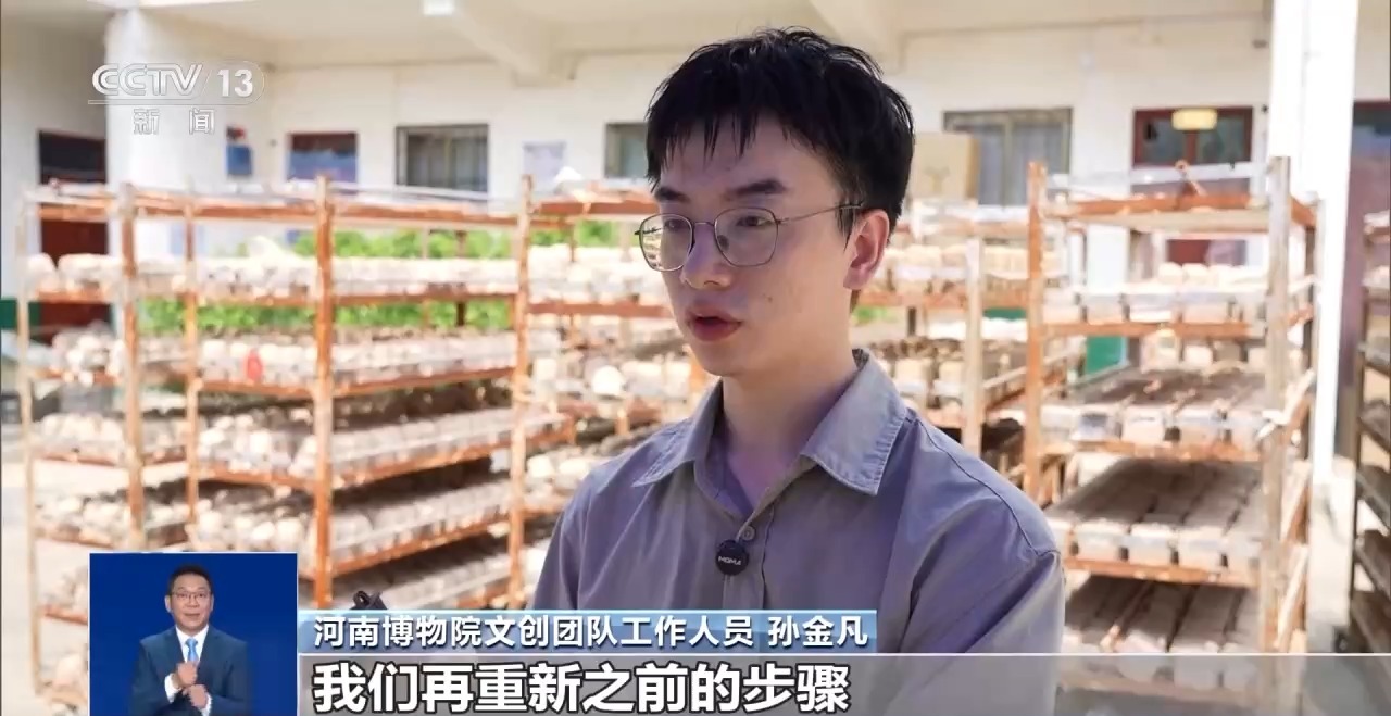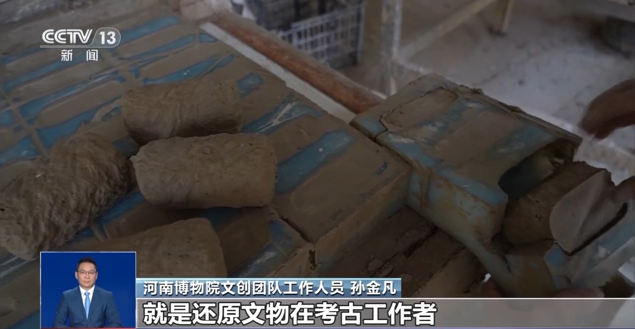 河南博物院文創(chuàng)團(tuán)隊(duì)工作人員 孫金凡:和泥巴、調(diào)配方、做試驗(yàn),每天都是灰頭土臉的,就是還原文物在考古工作者出土?xí)r的那一瞬間。同學(xué)就會(huì)問,還在村里面呢?我說對(duì),還在那和泥巴。