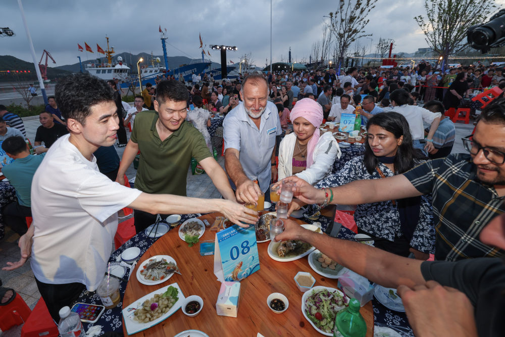 8月23日,游客在岱山縣長(zhǎng)涂鎮(zhèn)舉行的海島特色黃魚宴上舉杯。新華社記者 徐昱 攝