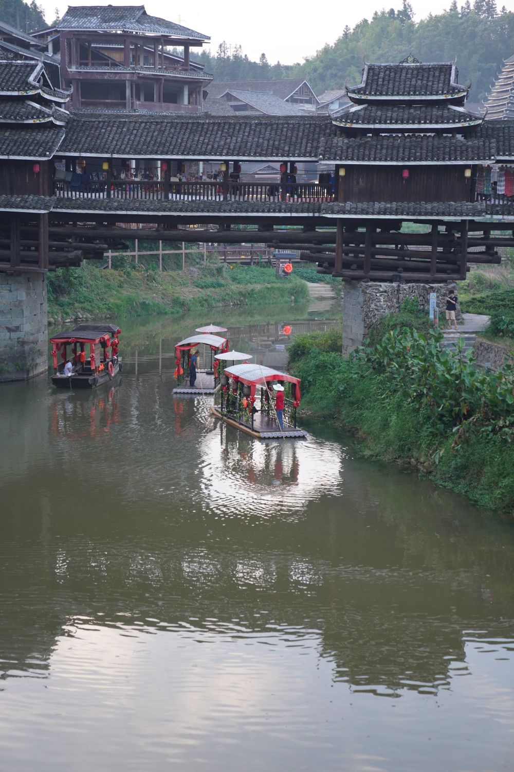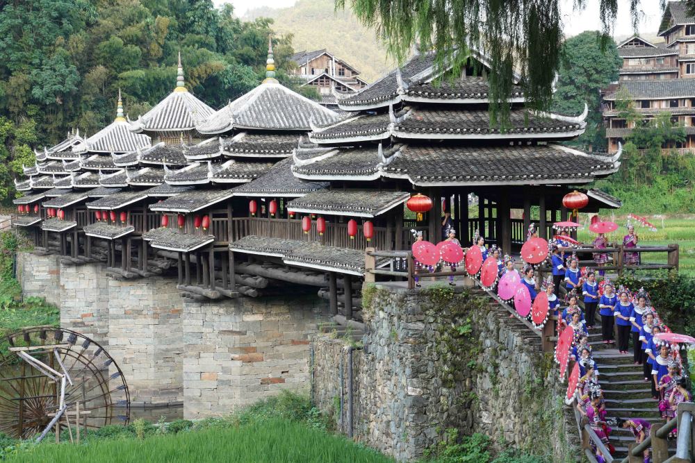 侗寨跨水而建。進(jìn)入程陽(yáng)八寨,首先要走過今年迎來100歲生日的程陽(yáng)永濟(jì)橋。此橋是樓閣式建筑,整座橋梁搭建時(shí)不用一釘一鉚,主要由木料和石料建成,橋長(zhǎng)近80米,寬近4米,高近12米,是我國(guó)建筑藝術(shù)中的珍品。