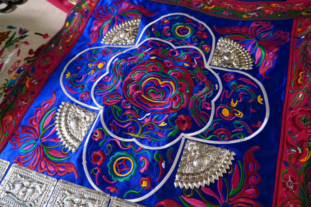 侗繡承載著侗族人的信仰與記憶,大自然是繡娘的靈感來源,花鳥蟲魚、太陽(yáng)月亮在她們手中,轉(zhuǎn)化為令人嘆為觀止的圖案。年輕繡娘的手藝多半來自母親傳承,覃桂珍的母親韋清花正是一位侗族刺繡代表性傳承人,曾代表國(guó)家出國(guó)交流。一個(gè)月前,覃桂珍以母親名字命名的第二家“清花繡坊”開業(yè)?!暗谝患业觊_在縣城,第二家選在程陽(yáng)八寨。”