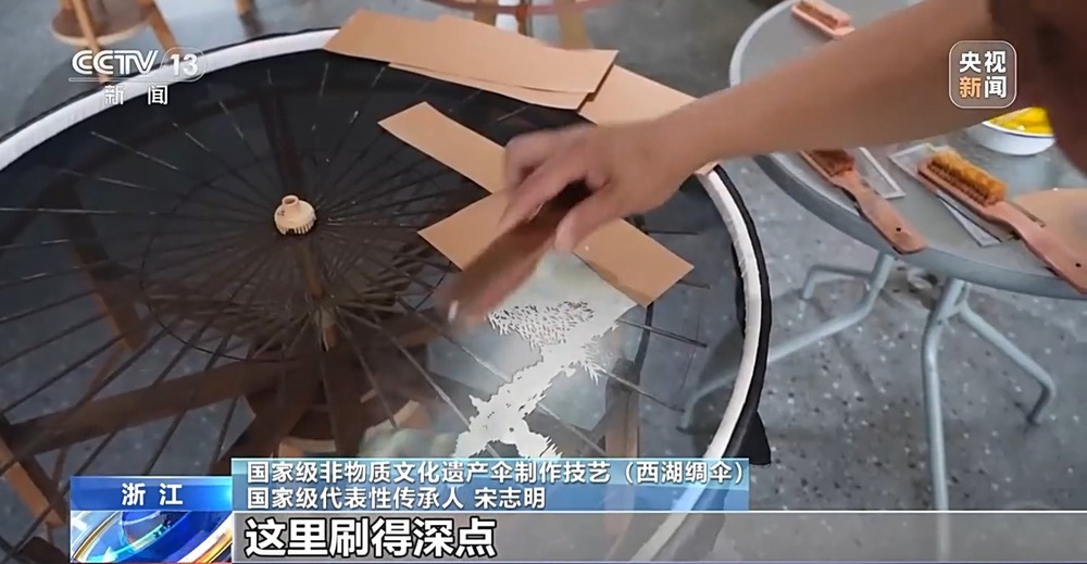 一個小時后,一幅由刷花工藝?yán)L成的三潭印月圖案躍然傘面之上,西湖風(fēng)景與杭州絲綢通過刷花這一手工技藝,完美地融合在了一起。