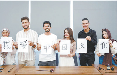 7月3日,埃及中國(guó)圖書中心揭牌儀式在埃及開羅巴德爾大學(xué)舉辦。圖為參加活動(dòng)的埃及大學(xué)生展示書法。