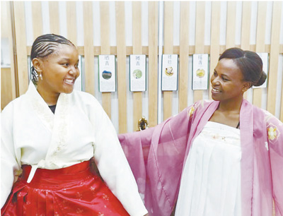 當(dāng)?shù)貢r(shí)間4月20日,為慶祝第十五個(gè)聯(lián)合國(guó)中文日,南非德班理工大學(xué)孔子學(xué)院舉辦以“說文解字,以茶會(huì)友”為主題的活動(dòng)?;顒?dòng)參與者身穿中國(guó)傳統(tǒng)服飾,共同探討漢字和茶文化。圖為兩名當(dāng)?shù)嘏⒃嚧┲袊?guó)傳統(tǒng)服飾。