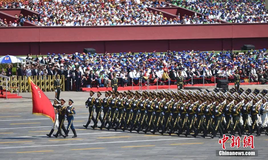 圖為2015年9月3日上午,紀(jì)念中國(guó)人民抗日戰(zhàn)爭(zhēng)暨世界反法西斯戰(zhàn)爭(zhēng)勝利70周年大會(huì)上,三軍儀仗隊(duì)通過(guò)天安門廣場(chǎng)。