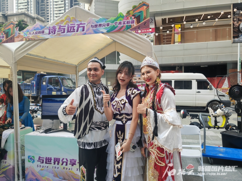 9月2日,“萬人說新疆”走進廣東分享會之新疆特色文化主題“大巴扎”在廣州市越秀區(qū)289藝術創(chuàng)意園區(qū)北廣場舉行。廣州市民陳婕(中)穿著新疆民族服飾與舞蹈演員合影留念。石榴云/新疆日報記者 甘興華攝