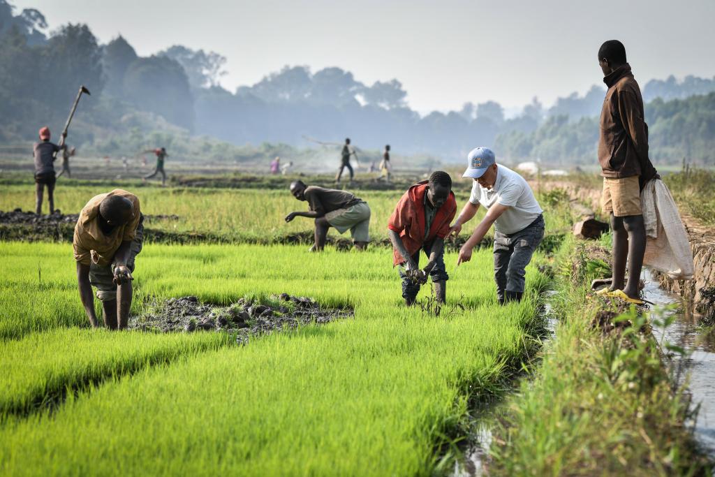 2024年8月14日,在盧旺達(dá)南方省胡耶區(qū),水稻專家鄭瑞金(右二)在稻田里指導(dǎo)當(dāng)?shù)氐巨r(nóng)進(jìn)行秧苗移栽。新華社記者 韓旭 攝