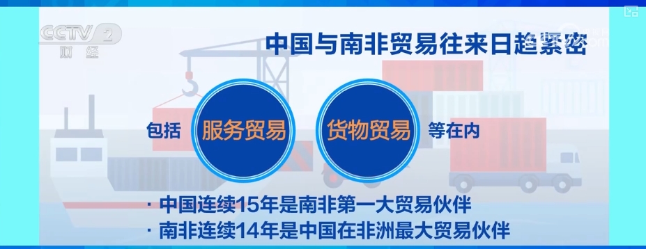 據(jù)統(tǒng)計(jì),包括服務(wù)貿(mào)易、貨物貿(mào)易等在內(nèi),中國連續(xù)15年是南非第一大貿(mào)易伙伴,而南非則連續(xù)14年是中國在非洲最大貿(mào)易伙伴。2024年前5個月,雙邊貿(mào)易額達(dá)235億美元。其中,南非對華出口153億美元,同比增長近14%。