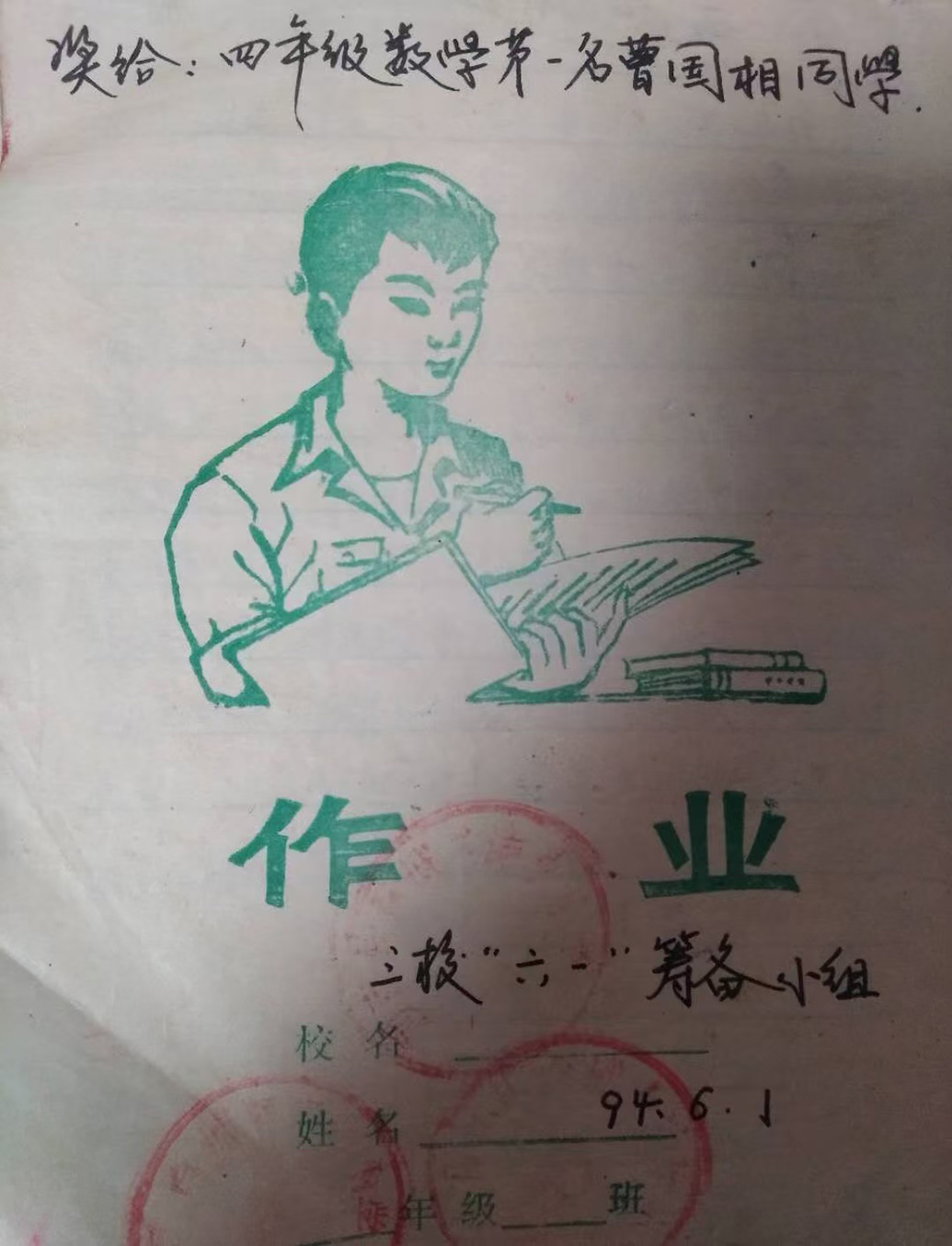 曹?chē)?guó)相小學(xué)三年級(jí)時(shí)被老師獎(jiǎng)勵(lì)的本子,他很珍惜。