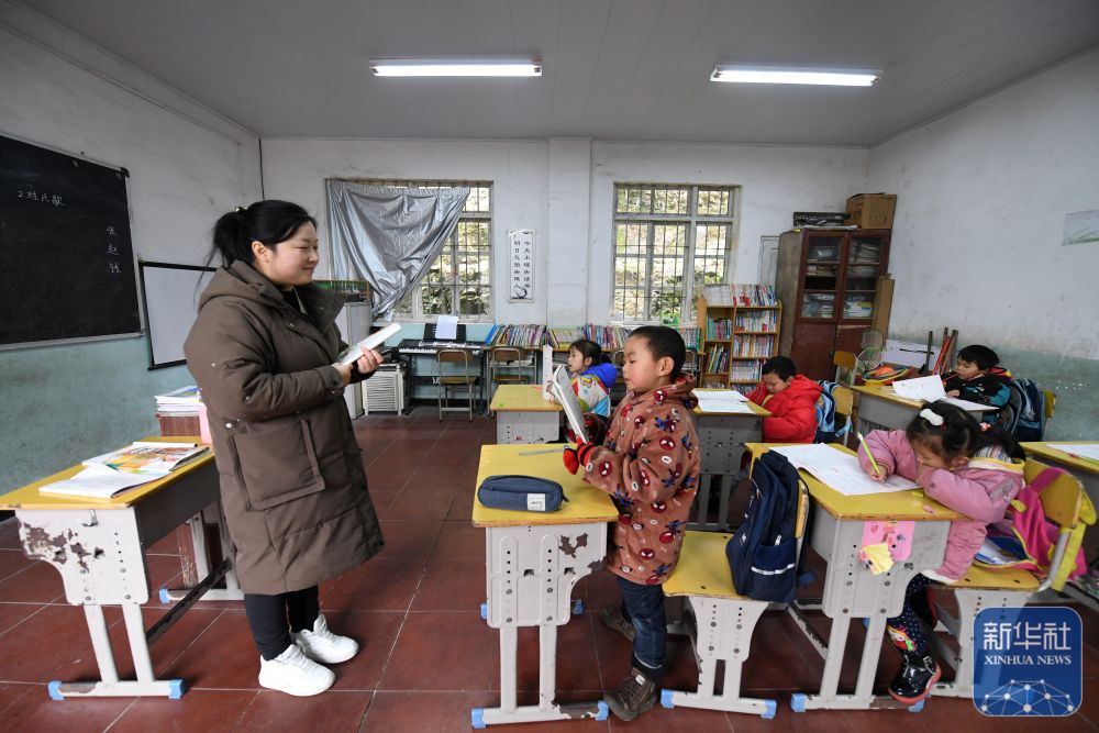在廣西靈川縣蘭田瑤族鄉(xiāng)東良教學(xué)點(diǎn),“85后”老師石夏月給學(xué)生上課(2022年2月24日攝)。