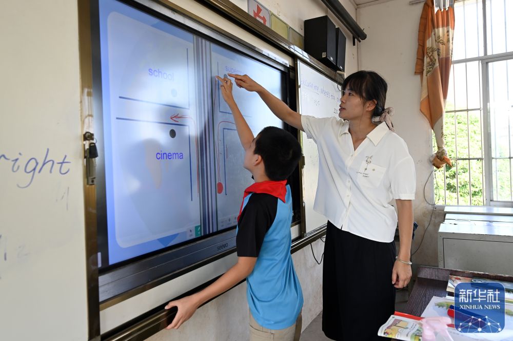 在廣西南寧市邕寧區(qū)中和鎮(zhèn)中心學(xué)校周祿教學(xué)點(diǎn),“90后”老師何海香指導(dǎo)學(xué)生完成課堂作業(yè)(2024年9月4日攝)。