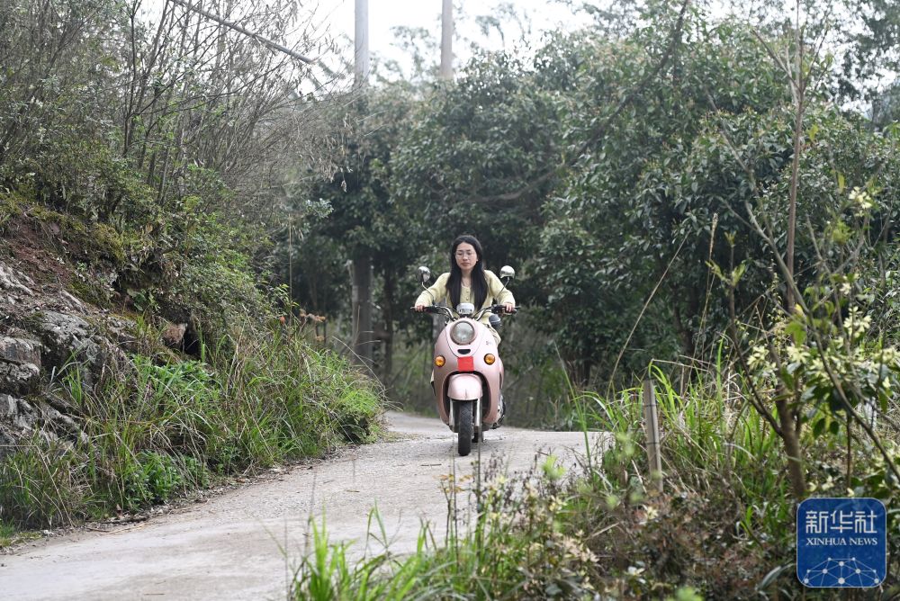在廣西灌陽縣洞井瑤族鄉(xiāng)野豬殿村,“95后”老師趙艷騎著電動自行車從學(xué)?;丶遥?024年3月27日攝)。