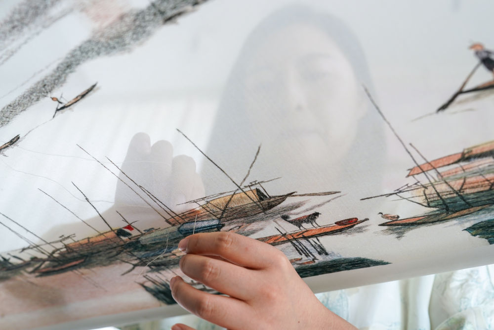 在蘇州高新區(qū)蘇繡小鎮(zhèn)的一家蘇繡公司,一位繡娘在加工蘇繡產(chǎn)品(7月3日攝)。