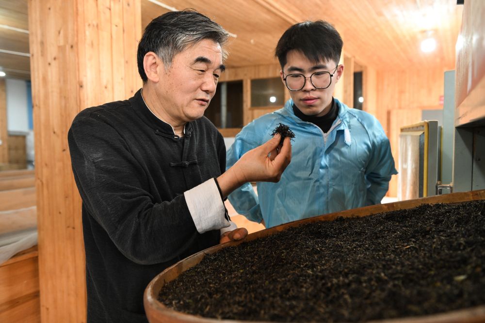 在蘇州市吳中區(qū)東山鎮(zhèn),蘇州市碧螺春制作技藝非物質(zhì)文化遺產(chǎn)代表性傳承人嚴介龍在傳授徒弟紅茶制作要領(4月11日攝)。