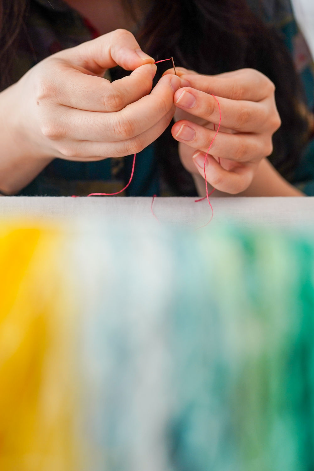 在蘇州高新區(qū)蘇繡小鎮(zhèn)的一家蘇繡公司,一位繡娘在穿針,準備加工蘇繡產(chǎn)品(7月3日攝)。