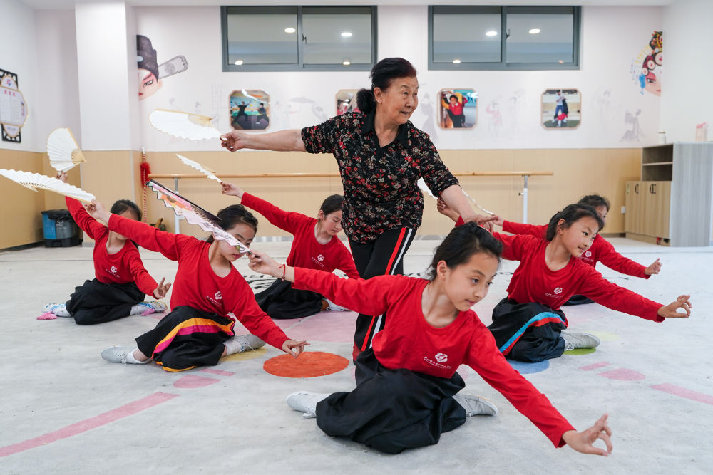 在江蘇蘇州昆山市石牌中心小學校“習美樓”的訓練房內(nèi),昆曲老師吳美玉(中)帶著小昆班的學員們進行扇舞訓練(5月30日攝)。