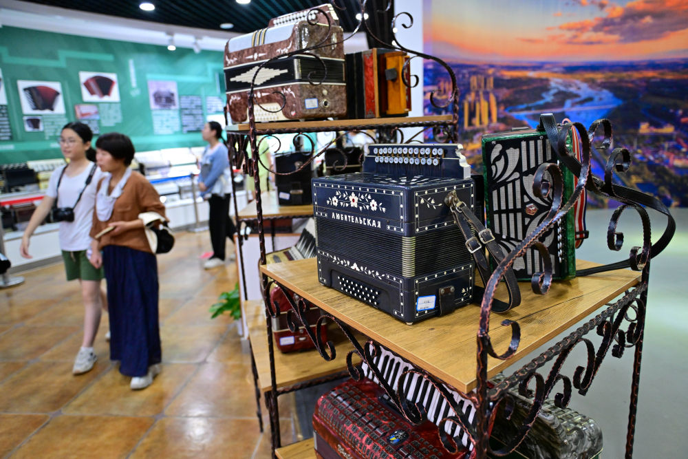 音樂舞蹈之所以在這里深受喜愛,與多民族文化在此深度交流交融密不可分。六星街上有一座亞歷山大手風琴珍藏館,800多架來自俄羅斯、意大利、德國、捷克等國的精品手風琴在此靜靜陳列,其中不乏手風琴中的“古董”珍品。這些手風琴的主人亞歷山大·謝爾蓋維奇·扎祖林是國家級非物質(zhì)文化遺產(chǎn)——俄羅斯族“巴揚(鍵鈕式手風琴)藝術(shù)”非遺傳承人?!坝们俾曌層慰透惺艿搅墙值拿利愊楹褪俏业男脑??!眮啔v山大說。