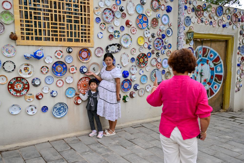 游客在新疆庫(kù)車(chē)市龜茲小巷拍照留念。新華社記者 丁磊 攝