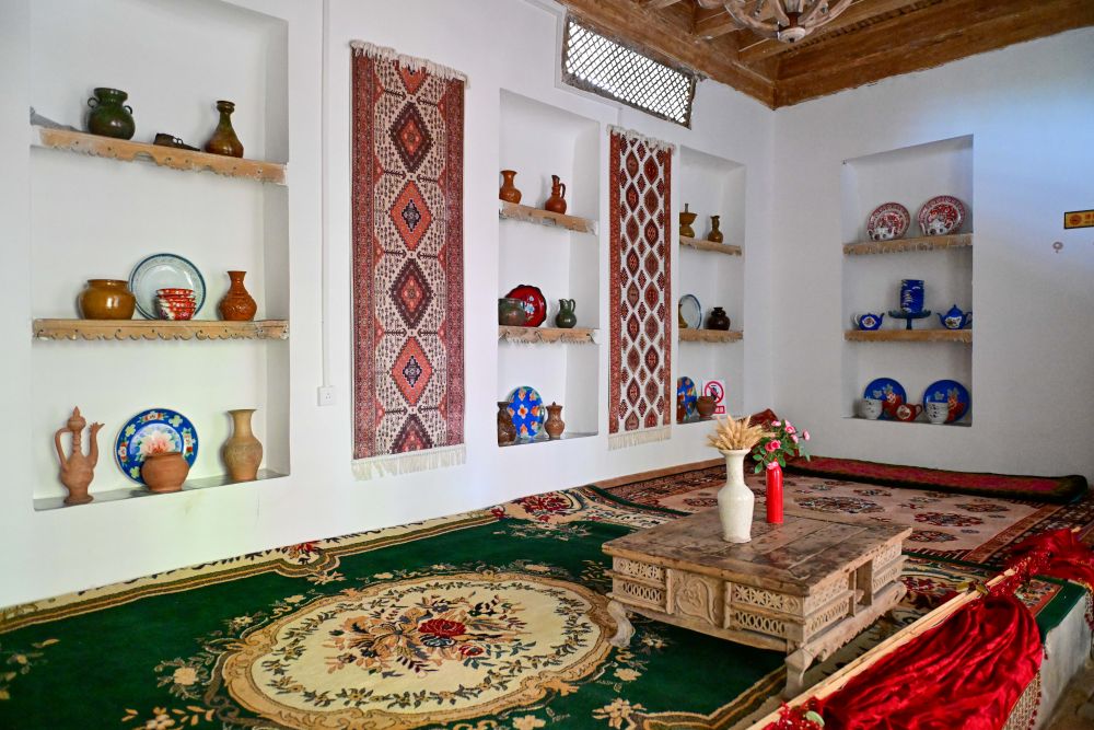 步入龜茲小巷,一幅巨大的地毯墻首先映入眼簾,地毯上大大小小的方格整齊排列,圖案精美對(duì)稱(chēng)、色彩艷麗。地毯是新疆少數(shù)民族家庭中最常見(jiàn)的裝飾品,一般以羊毛剪裁編織而成,集繪畫(huà)、雕刻、編織、刺繡、印染等手工技藝于一體,是展現(xiàn)新疆民族風(fēng)情的典型物品之一。