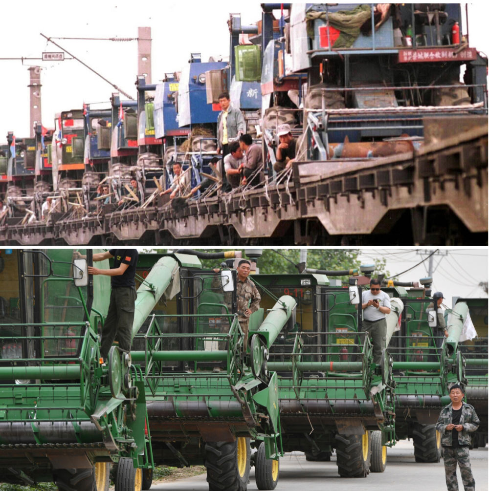 拼版照片:上圖為1999年,滿載著參加跨區(qū)收割小麥作業(yè)收割機(jī)的專列從石家莊鐵路分局正定火車站開出,將河北深州、藁城等地農(nóng)民的120多臺收割機(jī)運(yùn)往河南開封(新華社記者 周文廣 攝);下圖為2020年6月2日,在河南周口黃泛區(qū)農(nóng)場九分場,農(nóng)機(jī)隊伍準(zhǔn)備出發(fā)(新華社記者 李嘉南 攝)。