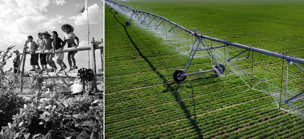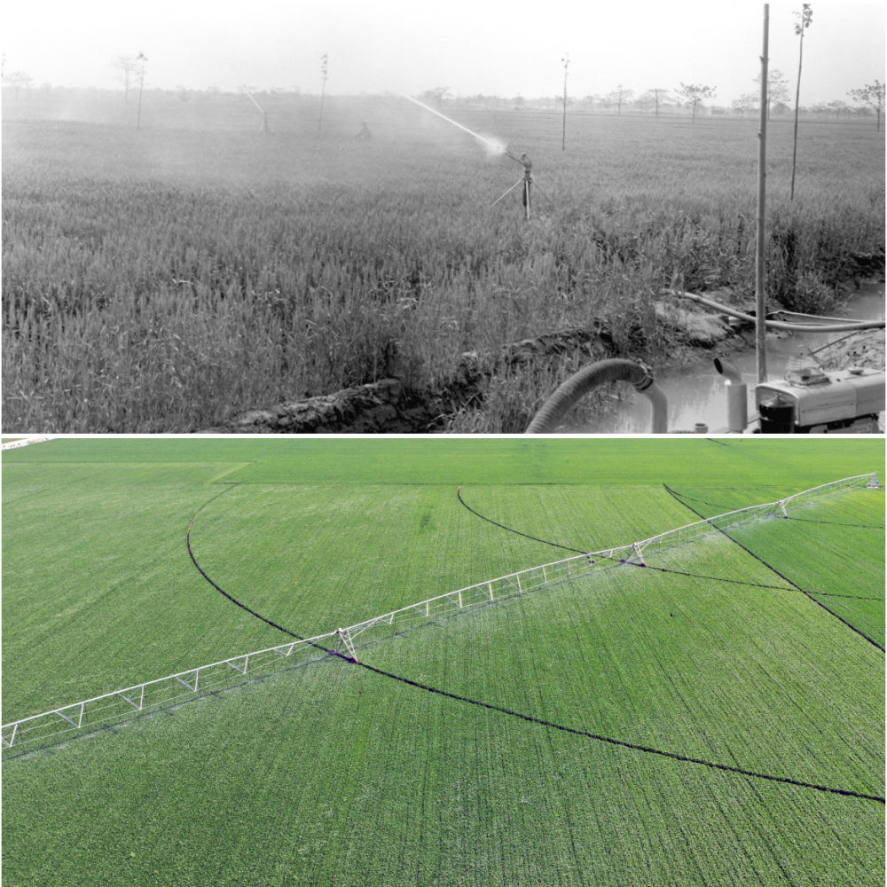 拼版照片:左圖為20世紀(jì)50年代,河南郾城萬金公社社員在踩水車澆田(魏德忠 攝);右圖為2017年3月9日,在河南浚縣王莊鎮(zhèn)一處麥田里,自走式智能噴灌機(jī)在進(jìn)行噴灌作業(yè)(新華社記者 李安 攝)。