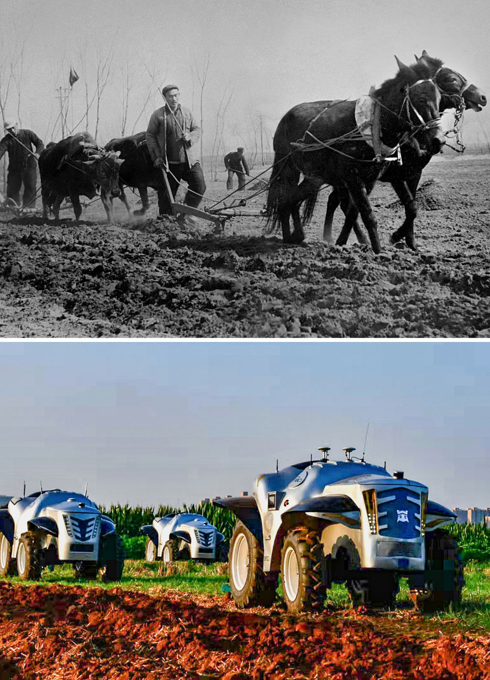 拼版照片:上圖為1954年,河南開封農(nóng)民在用傳統(tǒng)的畜拉步犁耕地(呂學(xué)召 攝);下圖為2019年7月26日,洛陽一拖集團(tuán)生產(chǎn)的純電動無人駕駛拖拉機(jī)準(zhǔn)備做耕地測試(潘郁 攝)。
