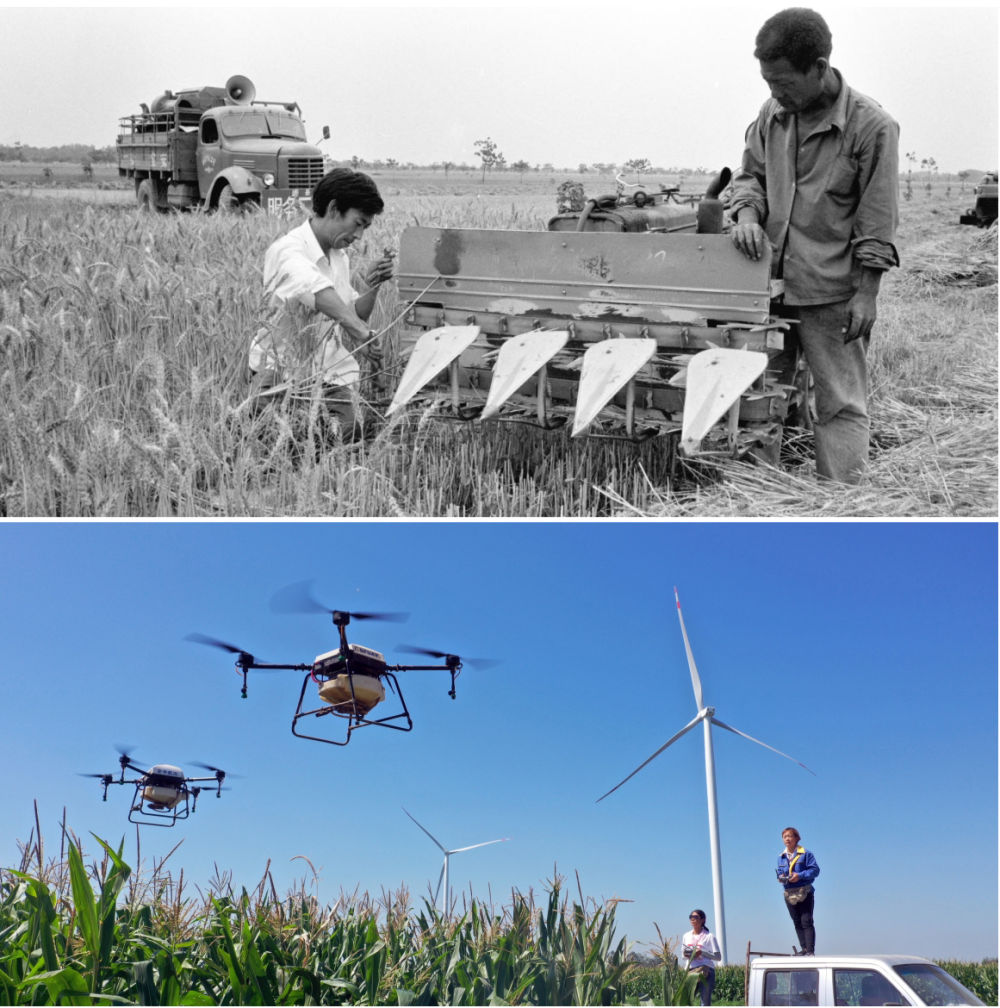 拼版照片:上圖為1986年,河南浚縣農(nóng)機(jī)公司組織服務(wù)隊走村串鄉(xiāng)義務(wù)修理農(nóng)業(yè)機(jī)械(新華社記者 唐茂林 攝);下圖為2020年9月4日,河南湯陰“精忠飛防大隊”飛手在操作植保無人機(jī)(新華社記者 李嘉南 攝)。