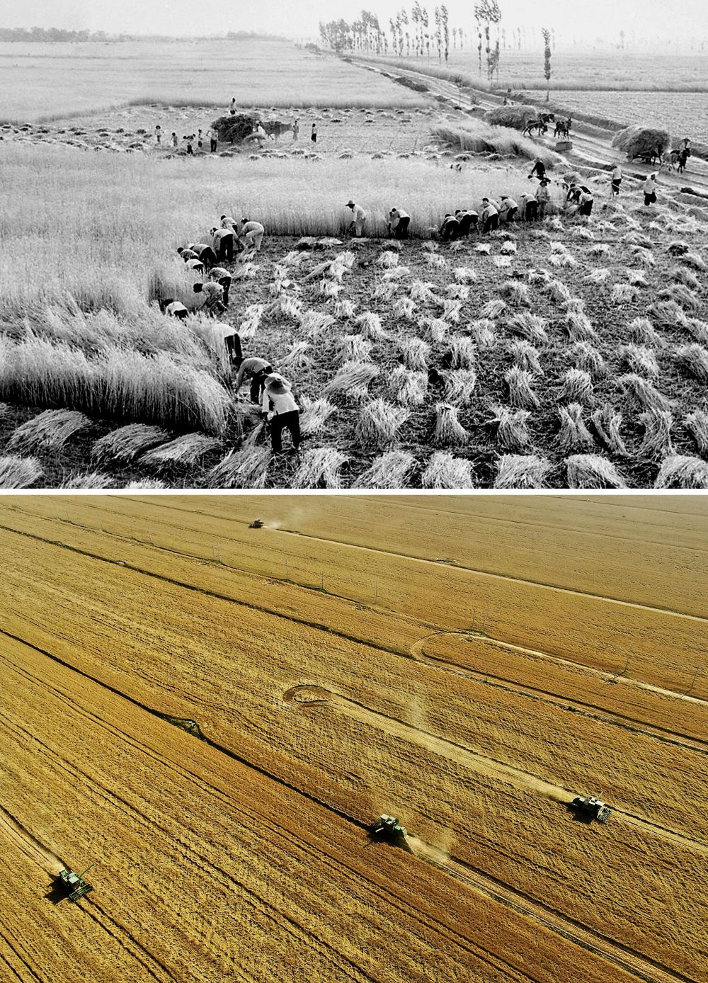 拼版照片:上圖為20世紀(jì)50年代,河南偃師萬畝豐產(chǎn)區(qū)開鐮收割小麥(新華社記者 唐茂林 攝);下圖為2021年6月6日,在河南周口黃泛區(qū)農(nóng)場九分場的麥田里,農(nóng)機(jī)手操作收割機(jī)收獲小麥(新華社記者 李安 攝)。