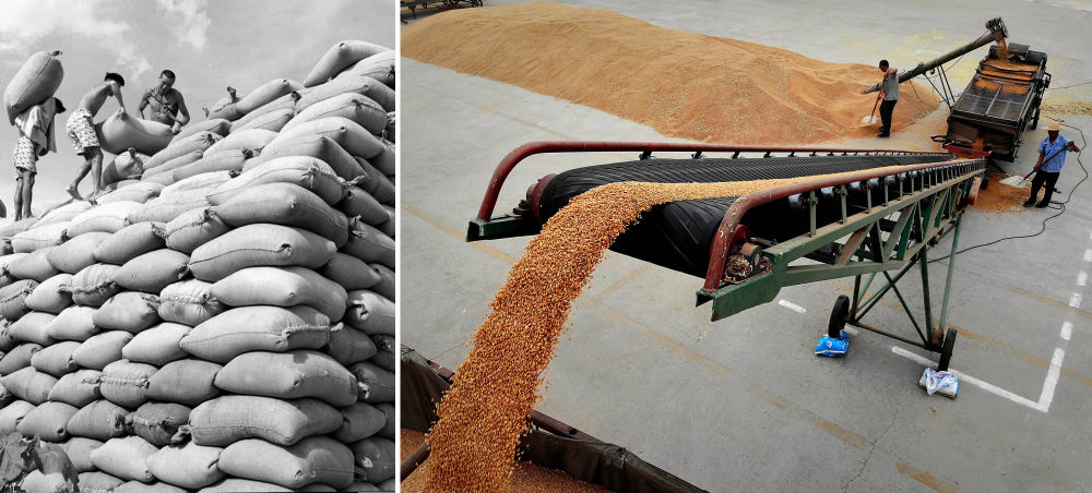 拼版照片:左圖為1959年,河南黃泛區(qū)農(nóng)場員工在堆放剛收打的小麥,準(zhǔn)備入倉(新華社記者 楊震河 攝);右圖為2018年6月4日,在河南黃泛區(qū)農(nóng)場,工作人員將剛收打的小麥過篩后直接裝車,準(zhǔn)備運(yùn)往糧庫(新華社記者 李安 攝)。