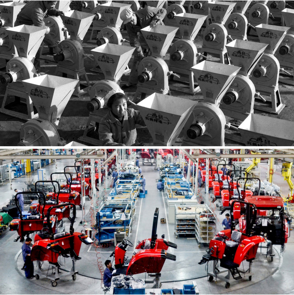 拼版照片:上圖為1971年,河南禹縣(現(xiàn)禹州市)生產(chǎn)的大批粉碎機(jī)準(zhǔn)備運(yùn)送出廠(蔡玉琦 攝);下圖為2012年9月12日拍攝的河南洛陽一拖集團(tuán)東方紅拖拉機(jī)生產(chǎn)線(新華社發(fā))。