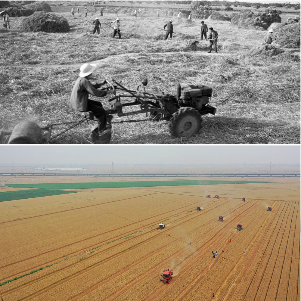 拼版照片:上圖為1982年,河南沈丘紙店公社紙店大隊13生產(chǎn)隊的社員用集體的手扶拖拉機(jī)碾打小麥(新華社記者 朱廣智 攝);下圖為2024年6月5日,河南省安陽市滑縣舉行小麥機(jī)收減損技能大比武活動,旨在規(guī)范節(jié)糧減損操作技能,減少糧食在收割環(huán)節(jié)的損失(新華社記者 郝源 攝)。