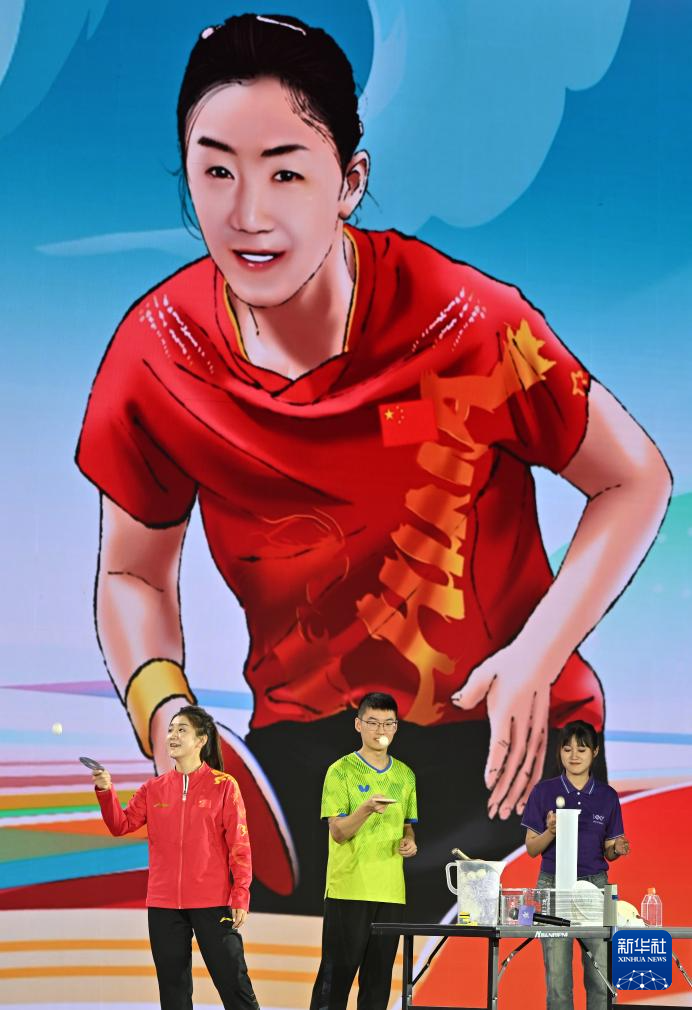 9月21日,奧運(yùn)冠軍陳夢(左一)在臺(tái)上和學(xué)生互動(dòng)。新華社記者 李然 攝