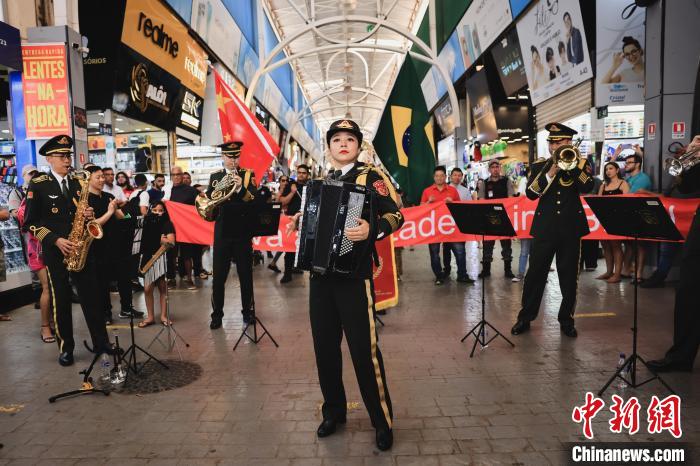 當(dāng)?shù)貢r(shí)間9月21日,巴西首都巴西利亞,參加中國軍事文化周活動(dòng)的中國人民解放軍軍樂團(tuán)演出分隊(duì),正在巴西利亞小商品市場演出。琚振華 攝