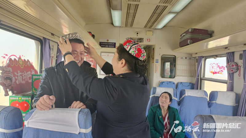 9月23日,7558次列車巴扎上,列車員瑪依然·賽買提給來新疆旅游的乘客戴上了一頂小花帽。石榴云/新疆日報記者 宋衛(wèi)國攝