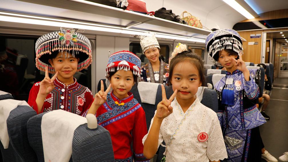 金秋九月,云南寧洱哈尼族彝族自治縣的青少年宣講團(tuán),在中老鐵路寧洱至昆明路段宣講民族團(tuán)結(jié)誓詞碑故事。