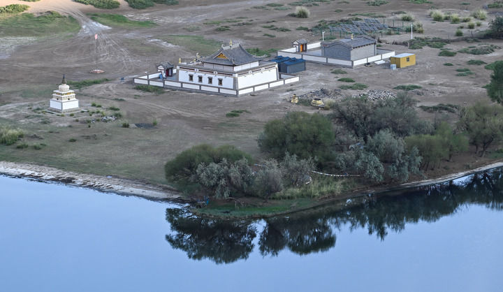 驅(qū)車深入巴丹吉林沙漠,翻過數(shù)不盡的沙丘,來到水草豐美的廟海子。這里四面環(huán)沙山,一座200多年前的白墻金頂寺廟坐落在湖邊,為雄渾壯闊的自然景象抹上一筆濃厚人文氣息。觀者無不感嘆,當(dāng)年交通不便,如何在沙漠腹地建成如此精美的建筑。