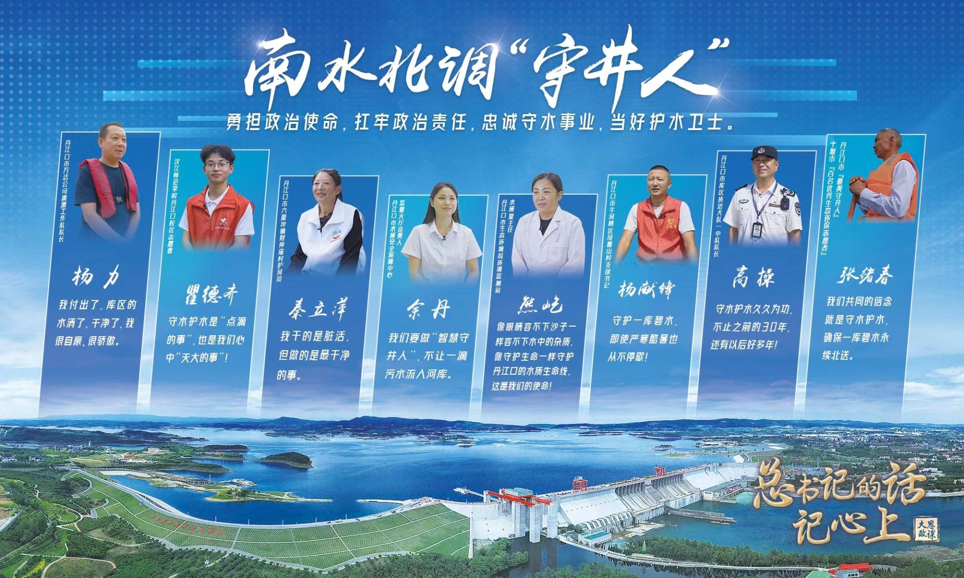 以前是漁民現(xiàn)在是清漂隊員的張旭春,十年守護重要入庫河流的護水員秦立萍,二十四小時在線的“智慧守井人”余丹,巡庫三十年的庫區(qū)執(zhí)法隊隊長高操……在這塊土地上,他們把水看得比自己的生命還重要。