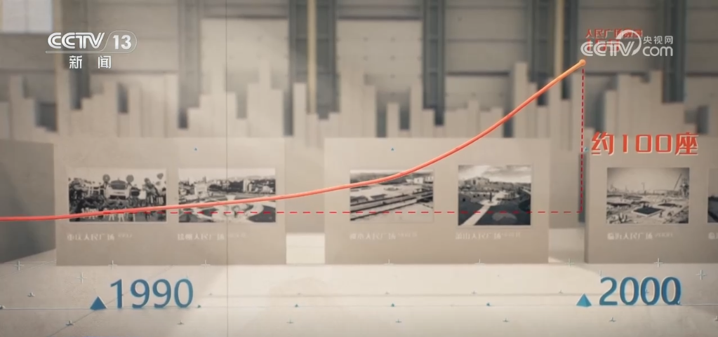 追溯歷史,將人民廣場的建設(shè)與時間線關(guān)聯(lián),我們發(fā)現(xiàn)了全國人民廣場建設(shè)的兩個重要時間節(jié)點:在90年代,隨著城鎮(zhèn)化的步伐,更多的廣場滿足了人們對公共空間的新需求,大約有100座人民廣場在這十年間建成。2013年左右,一股新的建設(shè)浪潮出現(xiàn)在小型縣城,尤其是在剛剛擺脫貧困的地區(qū)興起,人民廣場的增量又與脫貧攻堅的進程同步見證了一塊塊土地從貧瘠到繁榮的動人變遷。