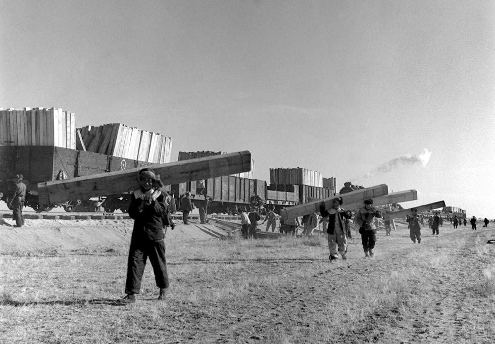 在內(nèi)蒙古集二線鐵路建設(shè)中,工人扛著枕木,前往鋪軌地點(diǎn)。集二線鐵路1953年5月開工建設(shè)。新華社記者 鄒健東 攝