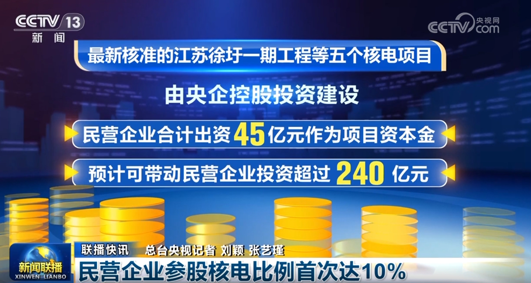 記者從國(guó)家發(fā)展改革委了解到,近期國(guó)務(wù)院核準(zhǔn)的江蘇徐圩一期工程等五個(gè)核電項(xiàng)目,由央企控股投資建設(shè),民營(yíng)企業(yè)合計(jì)出資45億元作為項(xiàng)目資本金,預(yù)計(jì)可帶動(dòng)民營(yíng)企業(yè)投資超過240億元。民營(yíng)企業(yè)參股核電的比例首次提高到了10%,核電領(lǐng)域進(jìn)一步向民資放開。