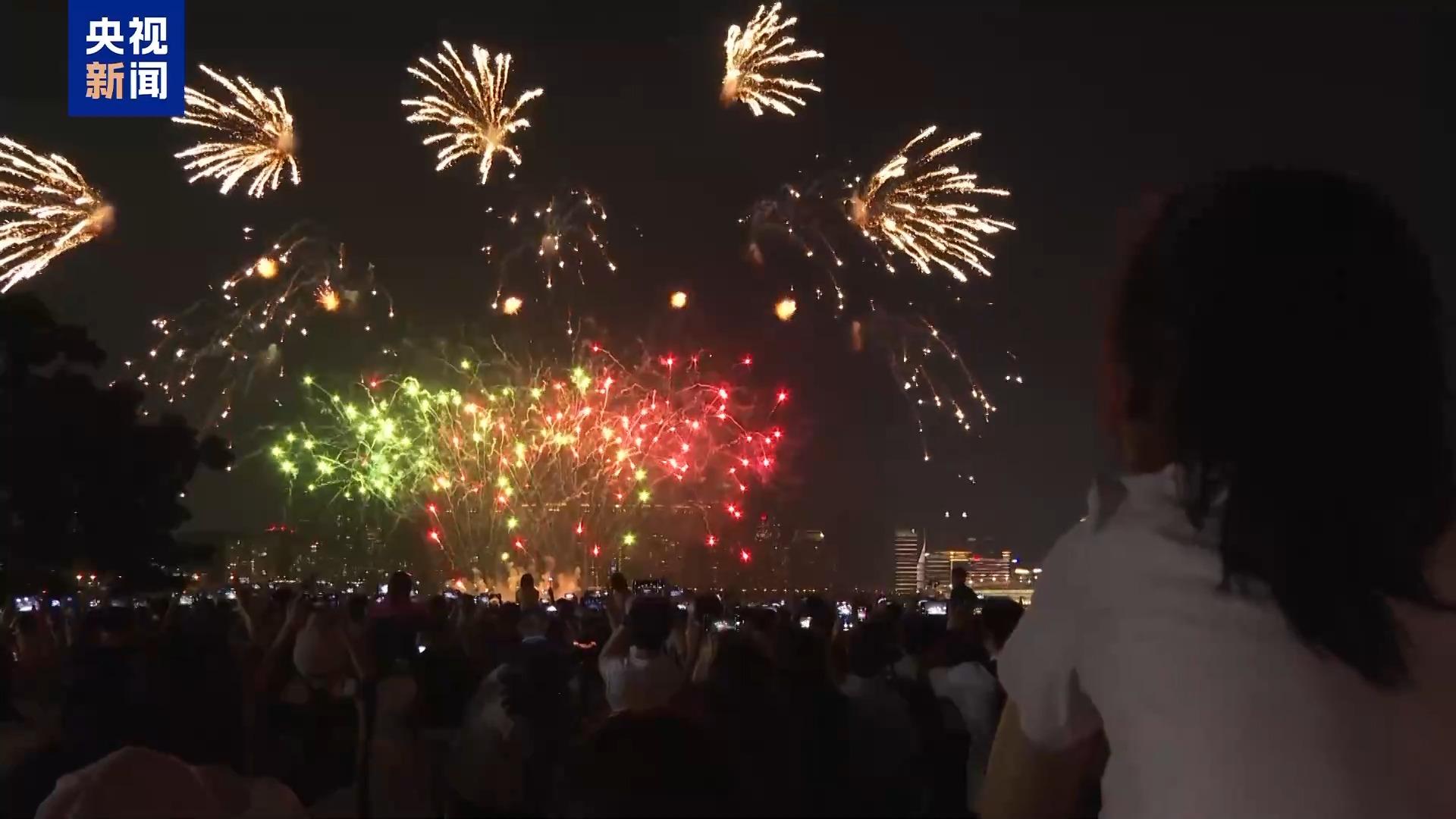 當(dāng)天21時,中方煙花公司率先拉開了煙花匯演的序幕,在《七子之歌》和《歌唱祖國》等歌曲的伴奏下,一束束璀璨的煙花在空中綻放,形成了光彩奪目的美麗畫卷。